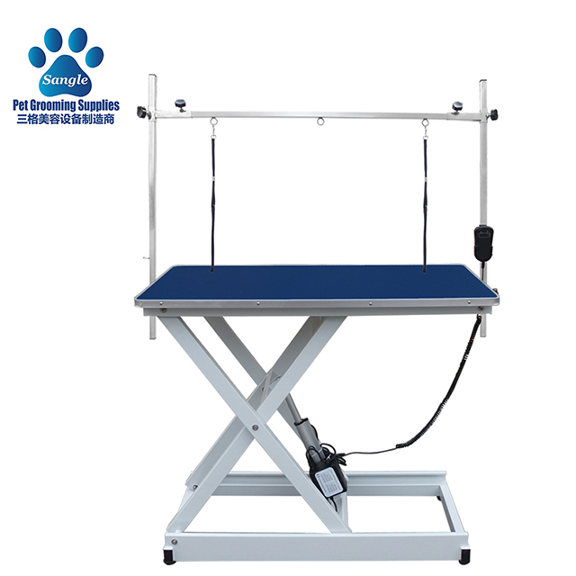 Sangle electric grooming table adopts imported anti-skid rubber veneer,high-strength wire-drawing aluminum bars,edge-wrapped,advanced electric lifting pump.
